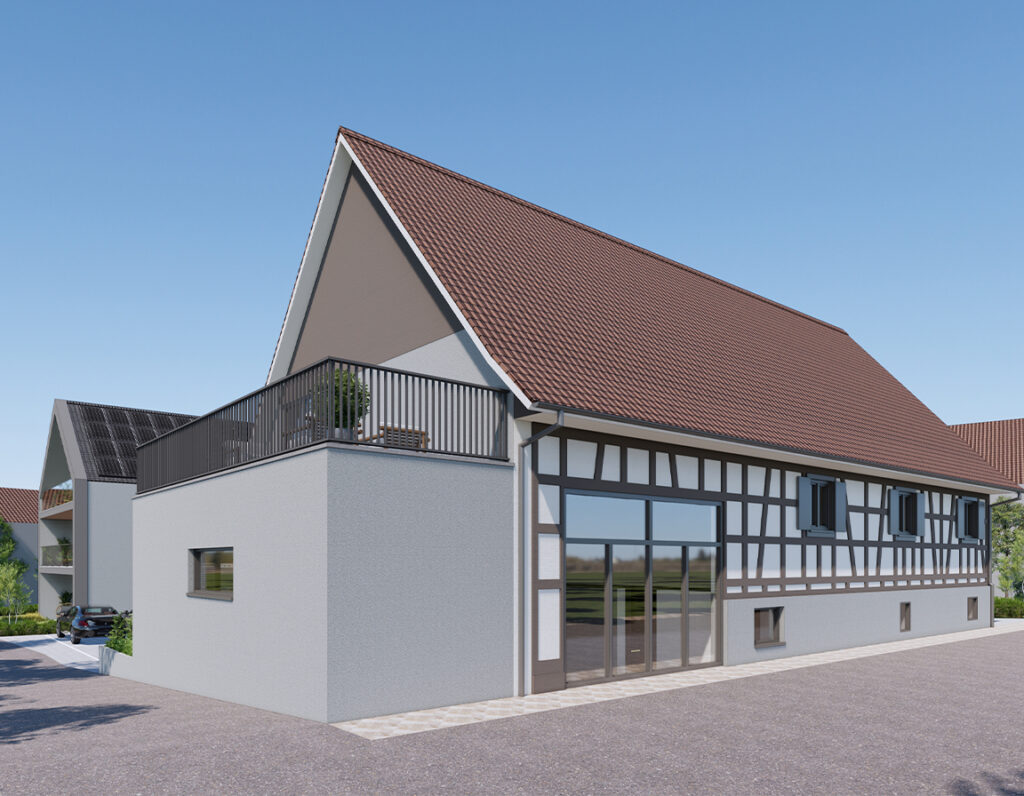 Energetische Sanierung und Erhalt des Geschäftsraumes, sowie Erweiterung auf 2 Wohneinheiten in den oberen Geschossen.